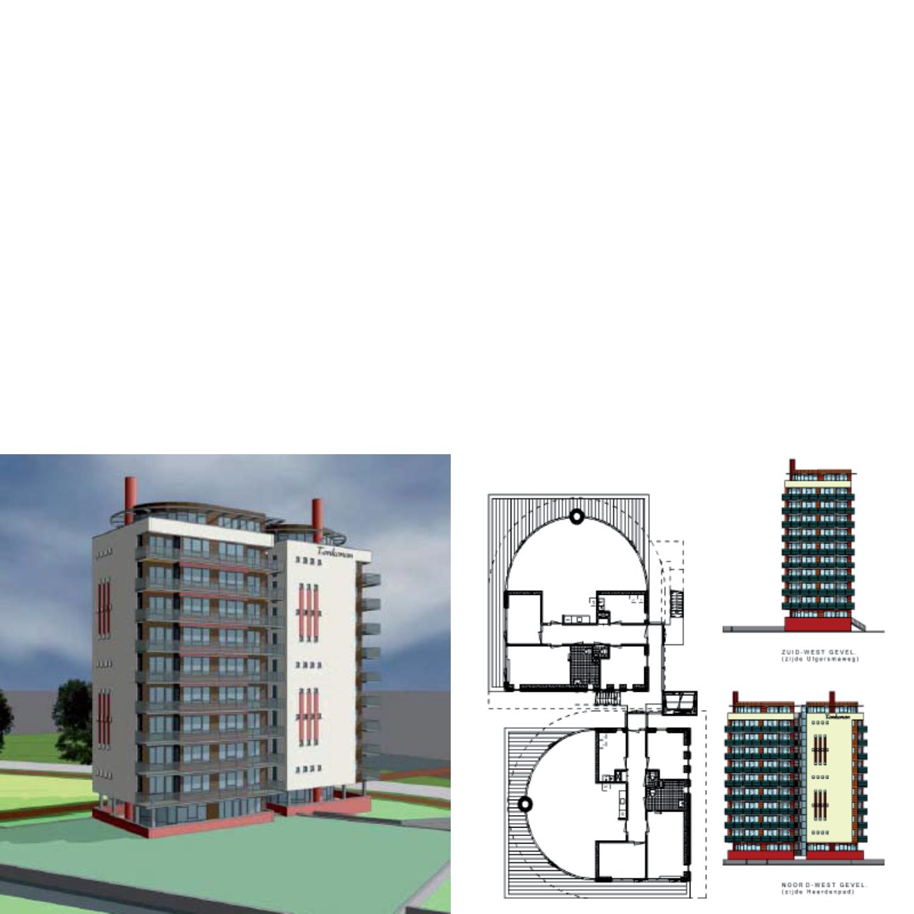 dak uitstekende schoorsteen in beeld terugkeert. Het plint van de woontorens is uitgevoerd in een donker rode steen, de