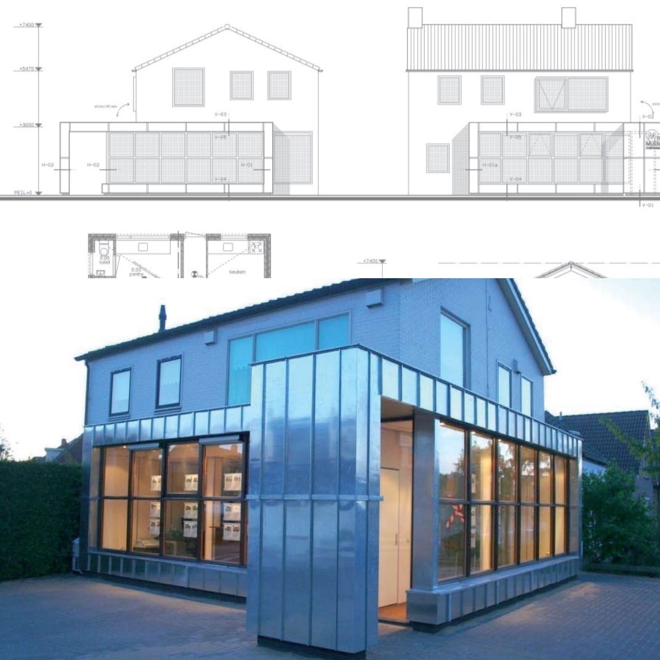 meranti kozijnen. Ter plaatse van de volledig glazen toegangsdeur verwijderd de zinken band zich van het pand, waardoor