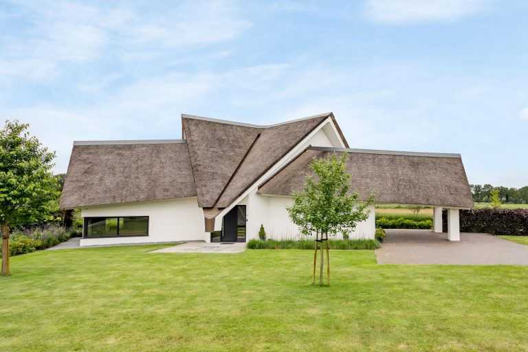 In het groene buitengebied tussen Nijverdal en Rijssen is een kleinschalig project ontwikkeld, waarbij de te bouwen woningen een bijzondere vorm mogen hebben. De vrijstaande villa bestaat uit een centraal gedeelte, afgedekt met een rieten kap welke naar het centrum, voor de voordeur, het dakwater via een koperen gootdeel in een onderliggende grindkoffer loost. Aan…